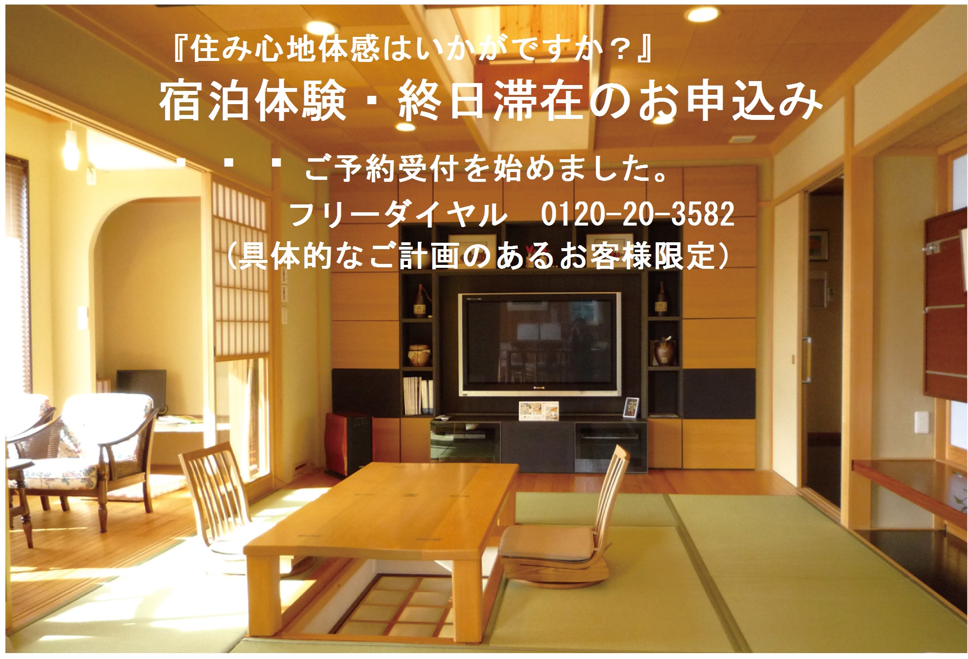 | 2019/1/7 | 本庄モデルハウス 宿泊体験お申込み受付中です。 お申込みは027-265-5500まで (具体的な建築予定のある方) ![]() |