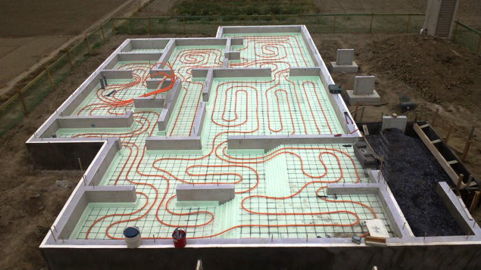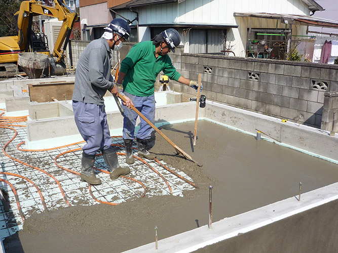 床下に設置した蓄熱用コンクリートスラブ内に温水パイプを配管し、暖められた不凍液を循環させ全館暖房を可能にしたHIROSEオリジナルシステムです。