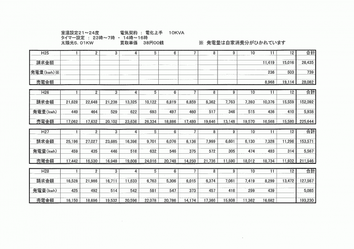 石油式から切替していただいた電力利用ヒートポンプ底力暖房の電気量の報告です。 5月に入り、電力利用ヒートポンプ暖房システムもほとんど稼働しなくなりました。 5月は稼働してもほんの少しだと考えまして、この冬のHPの 電気代を分析し、灯油暖房の時と比較してみました。 電力利用ヒートポンプ暖房システムの電気代は 装置本体にモニターする仕組みが ありますが、電気代は27円/kWhで計算されていて、我が家の電化上手の 料金体系にあった電気代は正確にはわかりません。 但し、太陽光発電のモニターについている日々の時間ごとの 電気使用量のグラフや東電から送られてくる料金表から推定 することはできます。詳細は添付資料に示します。その推定 結果は次のようになっています。 ①2018年冬シーズンのヒートポンプ暖房の電気使用量と料金は下記の通りです。 ・電力使用量 2585.2kWh (エネルギー量で9,307MJ) ・電気代 45,459円 ・平均の電気代 17.58円/kWh ②2012冬から2017冬までの6年間の灯油ボイラーのランニングコストは 下記の通りです。 ・灯油使用量 918リットル/年(エネルギー量で33,514MJ) ・灯油代 84,049円 ・灯油ボイラー用電気代 6,199円 ③ヒートポンプ暖房と灯油暖房のランニングコストの比較 灯油ボイラー: 90,248円 HP電気代 :45,459円 でその差額は 43,789円(灯油の約50%) 灯油ボイラーの半額で運転できる計算です。 ④HPの実効的なCOP HPのカタログ値は4.39です。但しこれは外気温7℃の値であり、低温時には 効率が低下します。実効的なCOPは②のエネルギー量を①のエネルギー 量で割ってやれば出ます。 その結果は 3.60です。 大事なのはカタログ値ではなく、この実効値こそが大事です。 3.60はかなり良い値だ考えます。 ⑤灯油ボイラーからHPに変更した場合にその節約効果で購入費用が 賄われるまで要する期間の計算 この場合、ランニングコストに加えて、灯油ボイラーの初期費用と交換の ための工事費用が必要になります。 ・購入費用を171,000円、工事費を180,000円、試用期間を1年とすると、 この償却費用は31,909円となります。 ・HP設置費用を980,000円とすれば、⑤の期間は =980,000/(44,789+31,909)=12.8年となります。 妥当な値だと考えます。 いろいろと仮定があり、細かな精度はありませんが、大外れはしていないと 考えます、 結論から言うとHPは大正解です。灯油の液量の管理等の問題もなく 経済的かつ環境にも優しい方法だと思います。 |