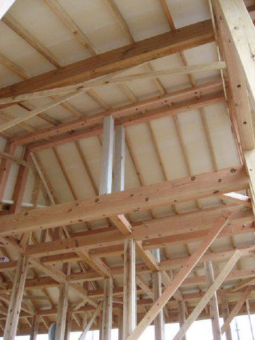 屋根を室内側から見上げるとこんな感じ☆ 屋根の断熱材が見えています。