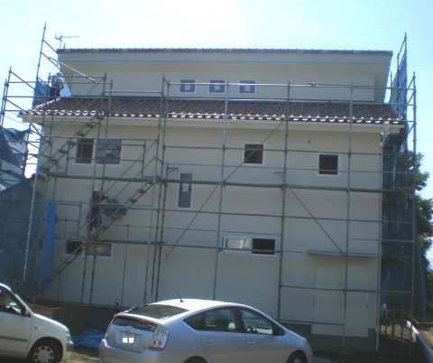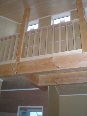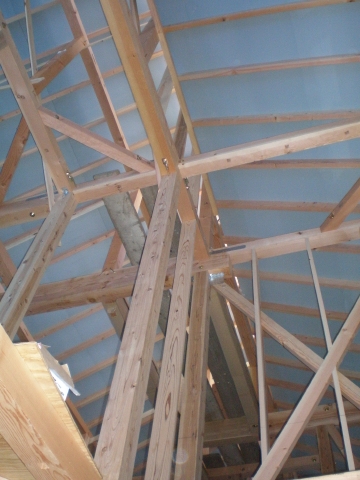 室内から上を見た写真。屋根の断熱材が見えています(青いのが断熱材)