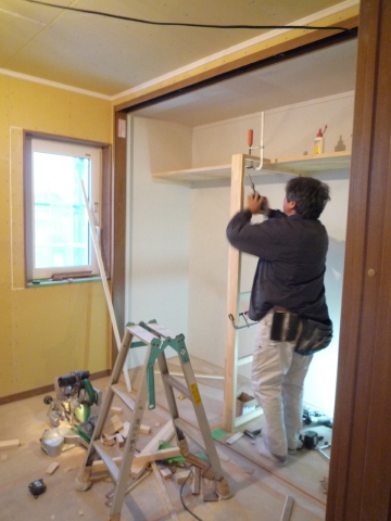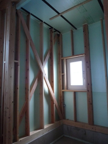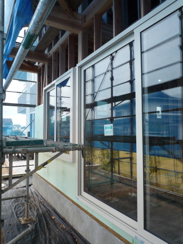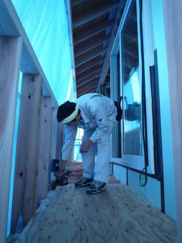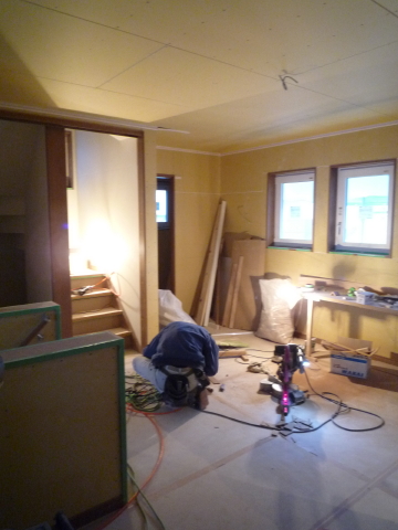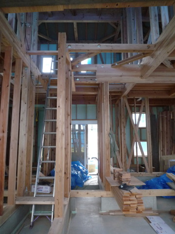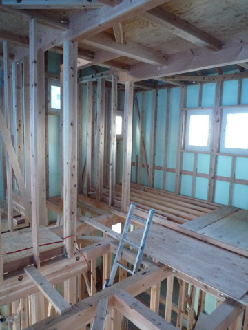 普段は青いシートに覆われてますが、断熱工事中の建物はこんな状態なんです