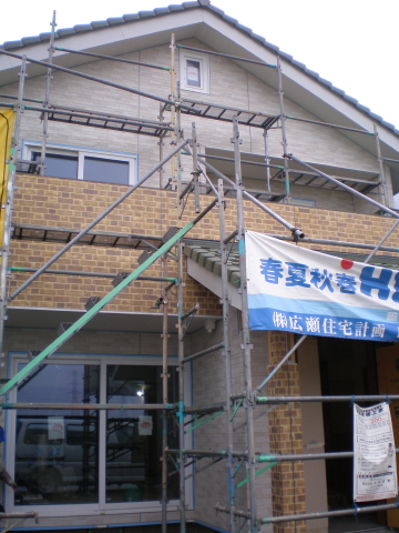 外壁工事進行中です。バルコニー部分は色を変えたんですね。完成が楽しみです♪