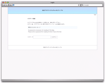 | ・ | パスワード認証ブログへの変身機能付 閲覧用の統一パスワードを設定可能。 予めパスワードを知らされた方のみ閲覧できるブログにする事が出来ます。 管理画面にてパスワード認証機能のON・OFF切替え(デフォルトはOFF)、パスワードの変更が可能。 ログインページに表示する管理者からのメッセージも管理画面にて変更可能。 ログインページはテンプレートにより、ご自由にデザイン変更が可能です。 |