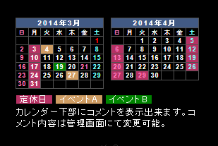 カレンダー設定の一例です。全て管理画面にて変更可能です。