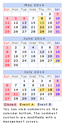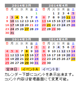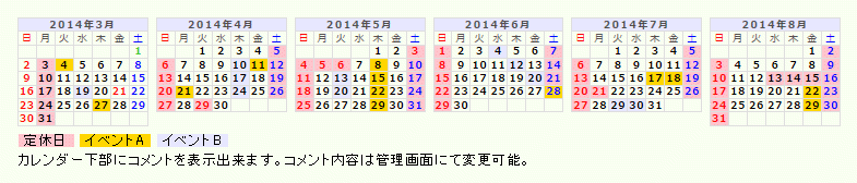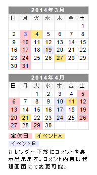 営業休日お知らせカレンダーCGI 2(レスポンシブ) カレンダー設定例