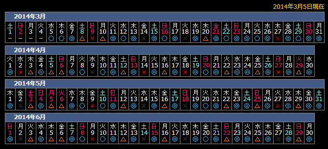 日~土 毎に折り返して表示するオーソドックスなタイプです。1行にカレンダーを1~3個表示します(個数は変更可能)。